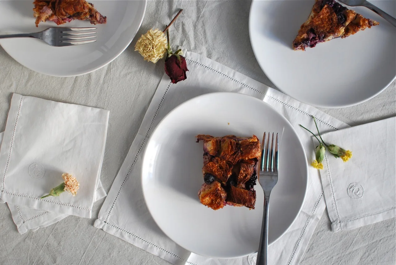 Today’s pastry bread pudding is a nostalgic one., made from gifted day-old pastries from friends, and a leftover jar of mum’s ultimate Lemon Curd; half of which fueled my favourite paintballing troops this past weekend. The other, served on Great Grand-Maman’s hand monogrammed handkerchiefs and eaten in my first London flat.