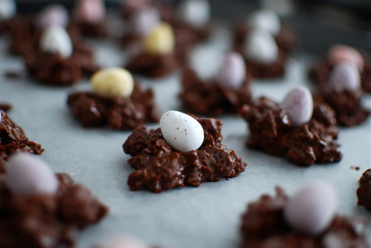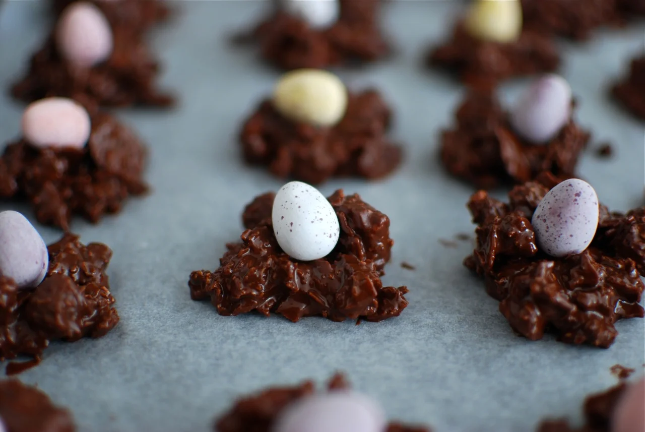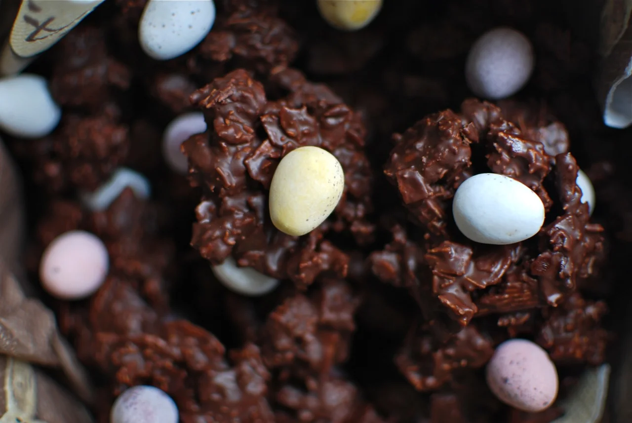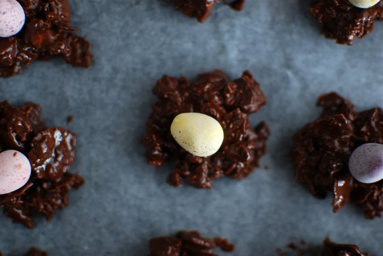 Carefully spoon walnut sized clumps of chocolate covered everything, and carefully shape into nests with a small dip in the centre, where you will then place a single (or double – depending on the size) Cadbury Mini Egg.