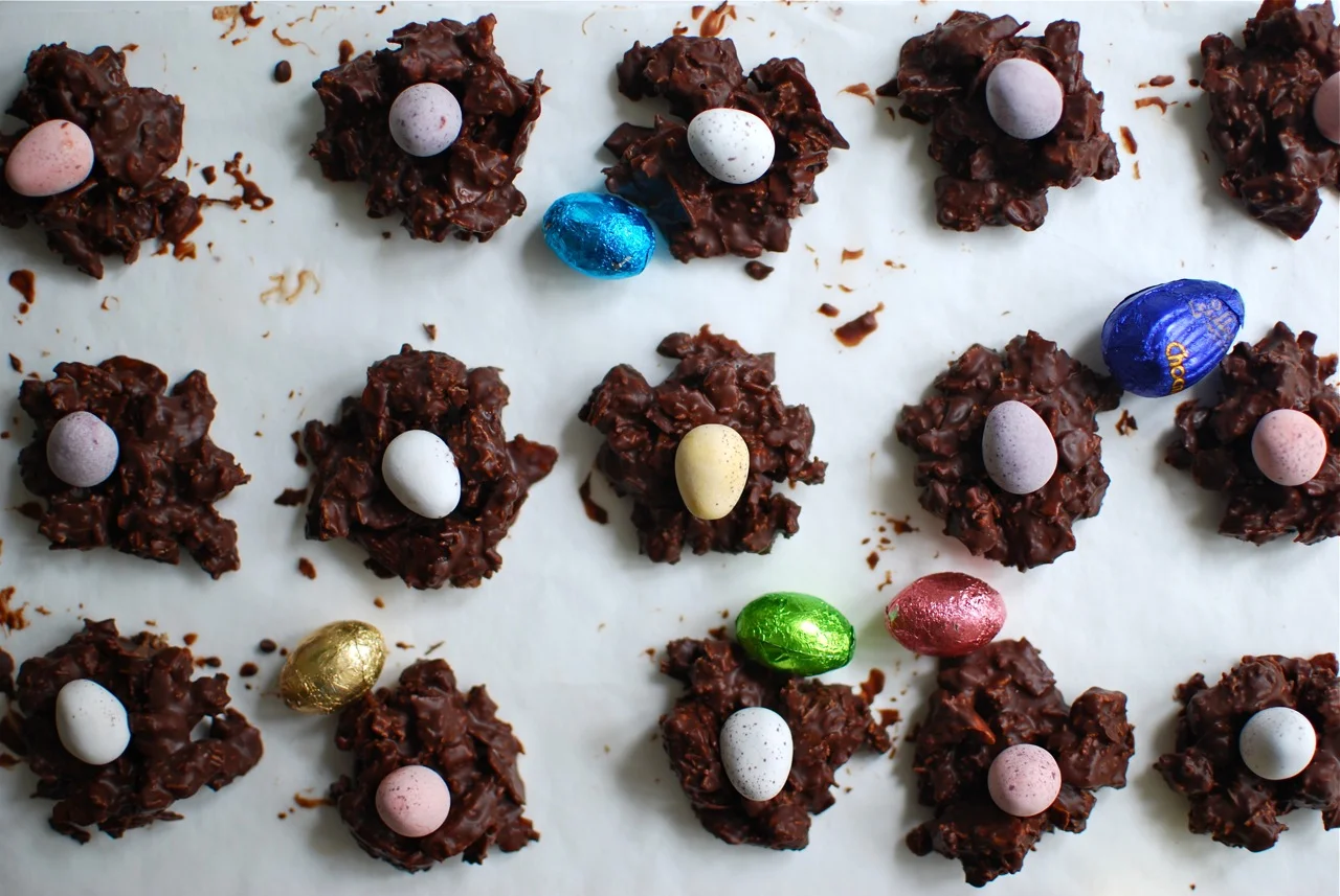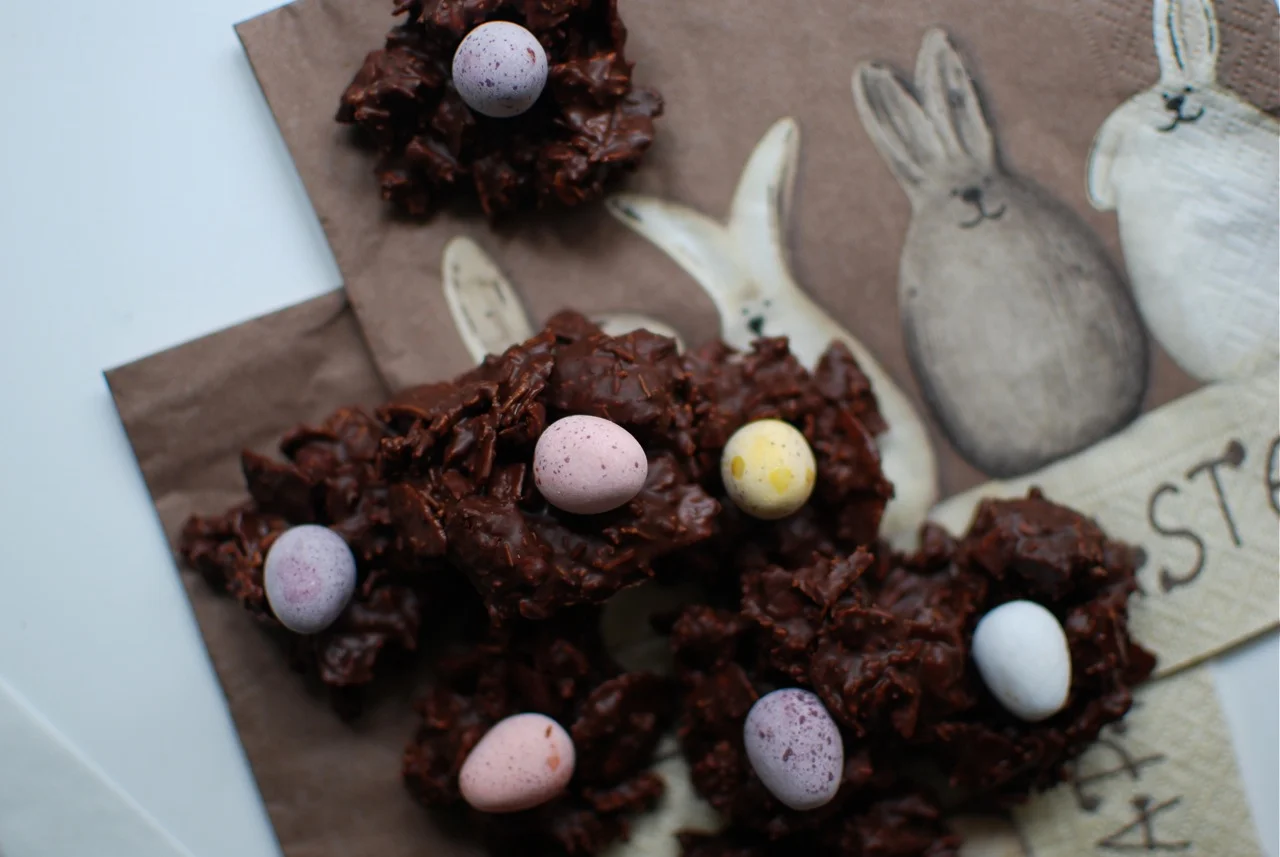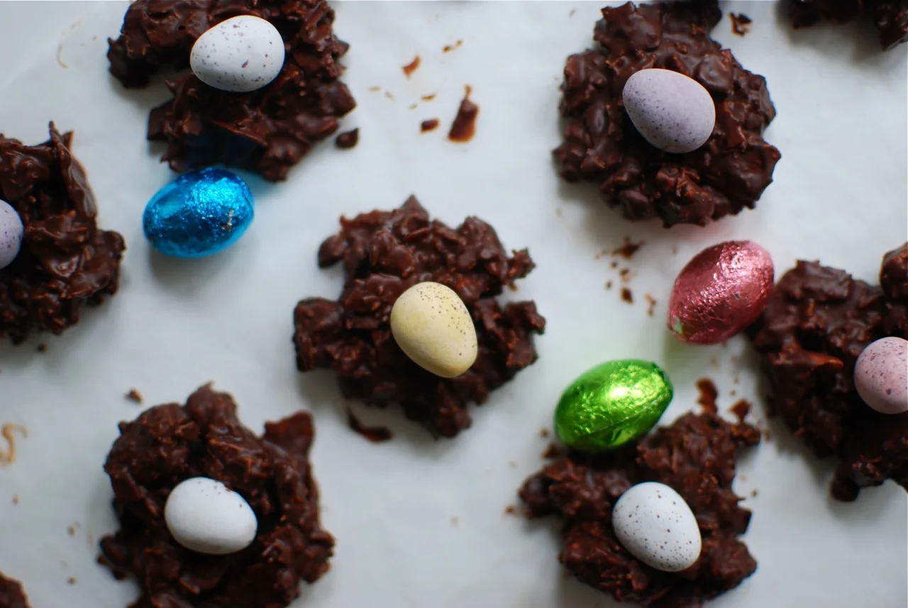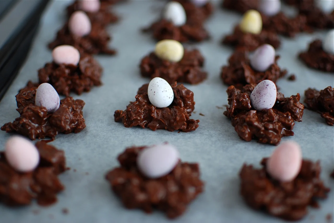 Carefully spoon walnut sized clumps of chocolate covered everything, and carefully shape into nests with a small dip in the centre, where you will then place a single (or double – depending on the size) Cadbury Mini Egg.